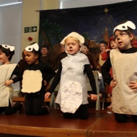 The Reception class at St Benedict's Junior School, Ealing staged an amusing and thoughtful Nativity play on Tuesday 10th December. 'Hey Ewe!' presented the Christmas story through the eyes of a sheep to a rapt audience of parents and children from other classes.As another ordinary, grass-eating day for the sheep on the hills is coming to an end one curious sheep cannot believe his eyes as a man and lady walk by with a donkey, followed by a chorus of angels singing in the sky. This is going to be no ordinary night! The other sheep are not interested and just want to go to sleep, but the curious sheep cannot be deterred and follows the shepherds to Bethlehem. He notices the crib looks hard and uncomfortable and offers his cosy fleece for Baby Jesus to lay on and is thanked by a smiling Mary and Joseph.