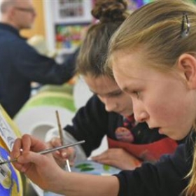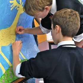 Bishop's Stortford College Prep School pupils showed their artistic flair this week painting book shaped benches for the Prep School library garden.Last year, the Prep School Friends purchased two blank benches for the Prep School library garden. Pupils took part in a competition to design their decoration and then the winners of this competition contributed to the final painting. To give a helping hand James Mayhew, author and illustrator of the Katie books and the 'Katie in London' bench, joined the pupils in the art room. He helped to create a special 'Katie in Bishop's Stortford' bench and another inspired by the theme of gardens in children's books.