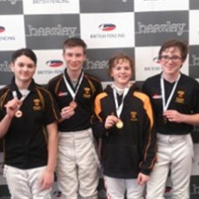 St Benedict's U18 Boys won the Gold medal in the Foil event at the British School Team Championships, held at Brunel University in Uxbridge on Saturday 28th February and Sunday 1st March. With the U11 Girls winning Silver and the U15 Boys Bronze, the three medal haul represents the best-ever result for the Ealing school.Despite losing to Eton by 1 point in the 1st round, the U18 boys qualified in fourth place for the knock out rounds. They saw off Millfield School in the semi-final, with Douggie Ashby coming back from 44-41 down to win 45-44. In the Final they met Eton again, this time with a different result. Lorcan O'Brien had a fantastic last bout to take the lead in the last round of fights. David Cuss maintained this lead and that gave Ashby a 10 point cushion for the final bout, leading 40-30. He held onto this lead, closing out the bout which finished 43-38. This victory was all the more impressive as the three boys are all Under 16 years of age.