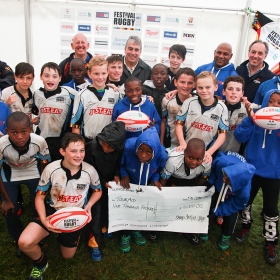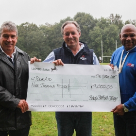 Bishop's Stortford College is working in conjunction with the charity TourAid by hosting a group of children from Botswana; the Thamelo Project, as part of the Festival of Rugby 2015. UK charity TourAid started in 2006 and has now facilitated over 70 groups of disadvantaged boys and girls to come to the UK from 34 different nations. Children from 9 countries are taking part in this year’s Festival including Loa, Keyna, India, Hong Kong, Uganda, South Africa, Swaziland and Colombia. The tour has a huge impact on those taking part; changes in attitudes, perceptions, aspirations, confidence and self-esteem are revealed and the children return determined to make their lives and the lives of those around them better. They become the coaches, mentors and role models in their home communities. It also gives College pupils an insight into how other people live. The team arrived from Botswana on Wednesday 30th September at Heathrow and were collected by Mr Barnard, Head of Rugby in the Prep School. The Botswanan team and their coaches joined the College community and stayed with 5 host families. The entire Prep School community has benefited from meeting the visitors, not just those directly involved in rugby, but in everyday classes too. The Prep School under 13 rugby team and the boys from Botswana then travelled to Henley RFC for their first tournament while in the UK. They played 5 games throughout the day which included teams from South Africa and 2 from Kenya. It was a great day of rugby, despite the rain. Bishop's Stortford College was able to present a remarkable £9,000.00 to TourAid at Henley. The College has been raising money for TourAid since July. The Arena Group, the Design & Build Delivery Partner for the Rugby World Cup, has been instrumental in raising the majority of this money by asking their suppliers to help TourAid as well. The College would like to extend enormous thanks to Arena Group and their community for their fundraising. Mr Muir of Arena Group, pictured here with John Inverdale (Patron of TourAid) and Chester Williams. Photographs courtesy of Arena Group.