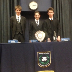 On Wednesday 20th April, Year 10 pupils Adam Hills, Matthew Adcock and Alfred Riddell gave a superb team performance to win the prestigious St Mary's Senior School Annual Public Speaking Competition. Alfred hosted the session as a calm, reassuring and professional Chairman; Matthew captivated the audience with his fluent, note-free talk on 'Materialism; and Adam gave a lively, amusing and skilfully relaxed proposal of thanks. The three managed to claim the impressive shield for Best Team - ahead of CRGS, CCHS, St Helena, St Benedict's, The Colne, and Philip Morant schools. Congratulations! Many thanks also to the competitors' parents, Mrs Long and Dr Georgiou for all their support throughout training and for attending the competition as audience.