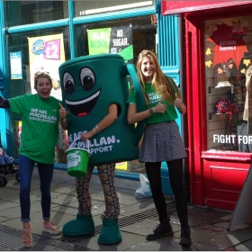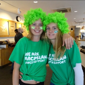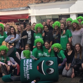 Ahead of the World's Biggest Coffee Morning, 71 of Godolphin School’s Sixth Formers donned green t-shirts, wigs and a 'muggy' outfit to raise money for MacMillan in Salisbury town centre. The girls split into groups and stationed themselves in various city centre locations, smiling, waving and rattling their collection tins at passers-by to attract their attention to this really worthwhile cause. Their base all morning was in Pret-a-Manger who were extremely supportive and were a welcome lunch venue for the hungry fund-raisers! At 1pm, all the girls congregated in the Old George Mall for a 'flash-mob' event which involved all the girls singing 'I'll be there for you', the Rembrandts song famous as the 'Friends' theme tune. They even had Godolphin umbrellas to open at the opportune moment 'when the rain starts to fall' (although it was actually a beautiful September day!)