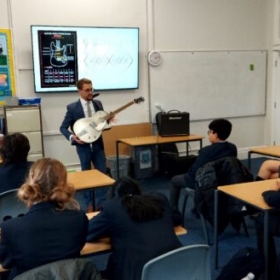Dr Davies delivered a most entertaining and informative presentation to the Year 9 Athenaeum this week on the subject of the electric guitar, the playing of which has been a lifelong passion.