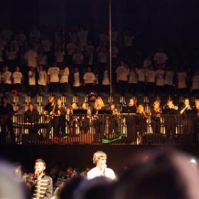 Caterham School's 'Show Band' was the only band that evening - they had rehearsed with featured vocal soloists only once but shone in true Caterham style delivering a powerful backing to the enthusiastic choir. The band comprised of students and staff forming a rhythm section, horn section and string ensemble. A highlight was during the sound check- when the band started to play, loud cheering and screams from the massed choir almost drowned them out! The evening performance complete with full light display was enhanced by the auditioned stage choir.