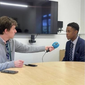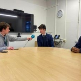 The fundraising efforts of students and staff in Angus’ Army featuring on Greatest Hits Radio news this morning. Angus’ Army, formed to support Sandringham student Angus, who was diagnosed with Hodgkin’s Lymphoma in the Summer, has now raised almost £20,000 for the Royal Marsden Cancer Charity. This has been achieved through running in the Oxford Half Marathon and 100 miles of the South Downs. Earlier this week, students Will Bowe and Rojhe Rowe (pictured above right and Alex Duke)and school Chaplain the Reverend Graham Wright were interviewed about their fundraising by Gordonian Alex Duke of Greatest Hits Radio.