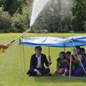 Leighton Parks ‘STEAMfest’ took place on Thursday 23rd May on Ten Acre Field at Leighton Park; the annual Key Stage 2 celebration of Science, Technology, Engineering, the Arts, and Maths, hosting over 250 Year 5 children from seven different Primary and Prep schools in the local area. The theme of the event centred around Helping in a Humanitarian Crisis and the pupils explored how STEAM could assist through three fun and interactive sessions. Pupils tackled hands-on challenges to build a stormproof shelter, transport essential aid on a raft and move clean water as efficiently as possible using tarpaulins. The Year 5s didn’t just gain important knowledge of what a Humanitarian Crisis is. As Leighton Park’s Deputy Head Academic, Alex Wallace, explained to our visitors “Our other aims of today are to get you thinking about problem solving, working in groups and collaborating with each other, because in the real world skills of teamwork are so very important”. Over the course of the day, the visiting schools were organised into three distinct sessions: Southcote Primary first, followed by Peppard Primary, New Christchurch Primary and Thameside Primary, with Maltman’s Green, Highfield Prep and Trinity Christian School in the final session. Each school split into smaller teams of five students and were each supported by Leighton Park Academic and Sports scholars. Shelter building was filled with squeals of laughter as the children endured the strong storm, which was created by Jeff Fuller, DT teacher, brandishing a hose! The teams were each given a selection of objects and materials including wooden posts, plastic tubing, bungees, long rope and piece of tarpaulin, from which they could use their imagination and iterative design to construct their shelters. When the storm came, the ultimate test was to see if any team members got wet