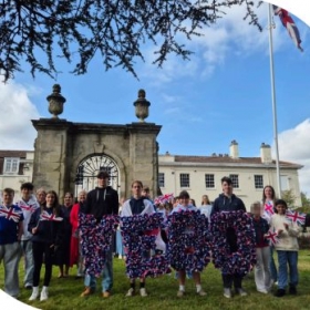 VE Day 80 has been commemorated in a variety of ways this year. Some members of the Year 8 History project group: Wickham L, Jonathan M, Ava D, Charlie I and Harriet F helped with attaching all of the red, white and blue tissue paper flowers made by all our tutor groups, to our VE 80 bases provided by Mr Bartlett in DT. This display was presented in the ceremony held at the flagpole on VE Day itself.